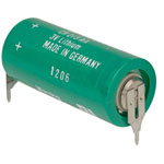 A 2/3 AA size lithium manganese dioxide battery with PCB mounting pins.