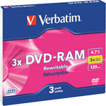 This DVD-RAM 3x 4.7GB from Verbatim is a recordable disc offering superior quality recording - ideal for sharing computer data, home videos, photos and music. Equipped with a 120-minute recording capacity, this rewritable disc is designed for data intensive, high performance applications. Data storage on DVD-RAM can be accessed in the same manner as a hard drive, with drag and drop capabilities. This disc is preformated in UDF 2.0.