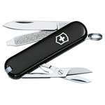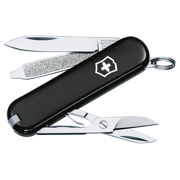 The Classic SD Swiss Army Knife has a small blade, a nail file with squared tip to use as a small screwdriver, scissors, a toothpick and some tweezers.