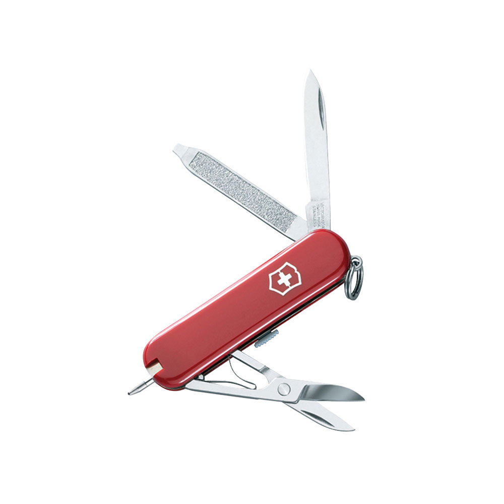 The Signature Swiss Army Knife has a small blade, a nail file with screwdriver, scissors, a keyring, a pressurised ballpoint pen and a pair of tweezers / toothpick.