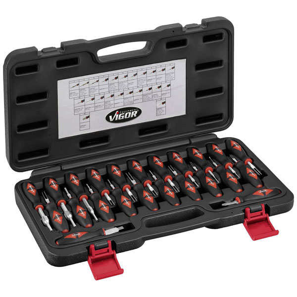 The Vigor V4451 cable release tool set, manufactured by Vigor, features precision-designed tools ideal for automotive applications. It aids in releasing and removing cables smoothly during car repairs. This set is essential for both professional mechanics and DIY enthusiasts working on vehicle maintenance.