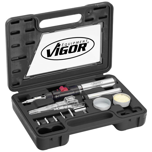 The Vigor V5512 gas soldering kit reaches temperatures up to 1300 °C. It includes a gas burner, making it versatile for various soldering tasks. Suitable for automotive, electrical, and precision repair applications.