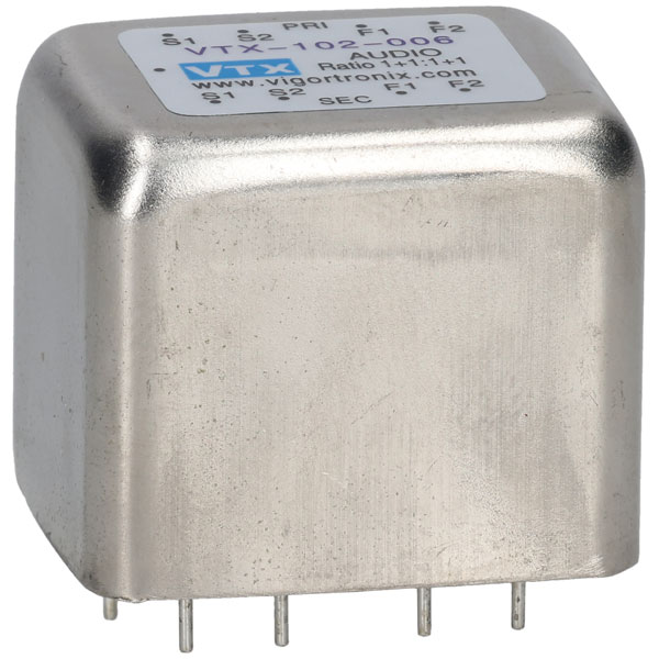 High quality PCB mounting audio transformer with Mu-metal can from Vigortronix aimed at the professional audio market. The VTX-102-0xx series offers good band width and low distortion characteristics. These transformers are bidirectional so that an input winding can become the output winding and an output can become an input. As a result, it can provide a gain in signal level when used in one direction or a loss when used in reverse.