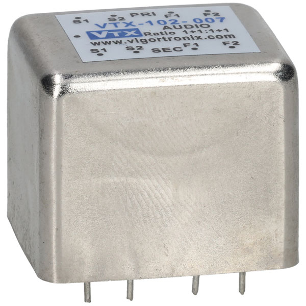 High quality PCB mounting audio transformer with Mu-metal can from Vigortronix aimed at the professional audio market. The VTX-102-0xx series offers good band width and low distortion characteristics. These transformers are bidirectional so that an input winding can become the output winding and an output can become an input. As a result, it can provide a gain in signal level when used in one direction or a loss when used in reverse.