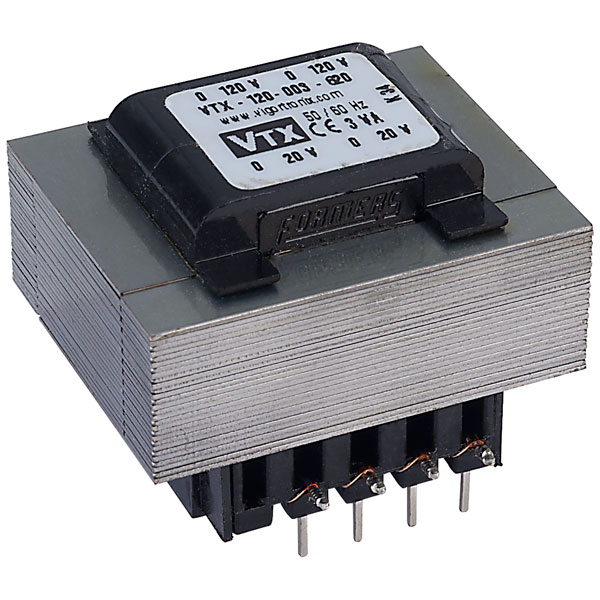 Open mains 3VA 0-20V, 0-20V transformer with dual primary and dual secondary windings, ideally suited for mounting on to printed circuit boards.