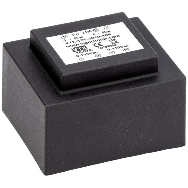 PCB mounting encapsulated transformer from Vigortronix, consisting of dual primary (2x115V 10VA) and secondary (2x0-9V) windings. Due to their construction and encapsulation these transformers provide excellent performance in aggressive environments where potential exists for changes in temperature and humidity.