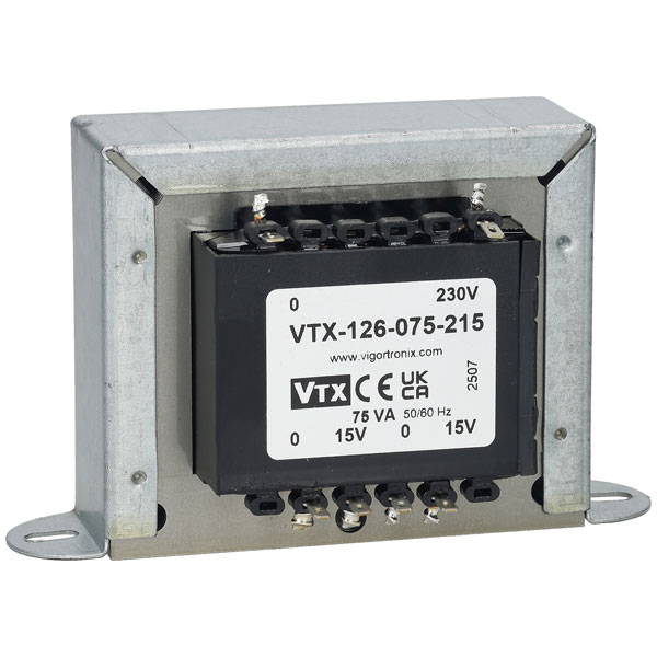 Vigortronix VTX-126-075-215 Chassis Mount Transformer 230V 75VA 15V+15V - A comprehensive range of general purpose chassis mounting mains transformer, with mounting clamp connection.