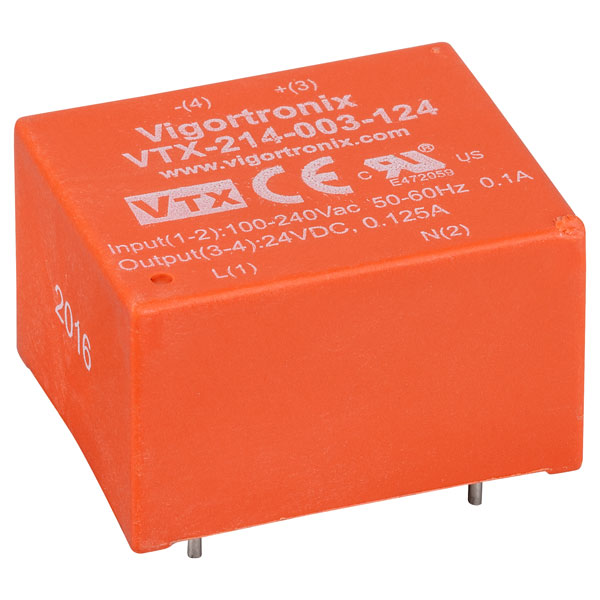 This AC-DC 4-Pin Power Supply with 3W Single Output from Vigortronix is a 24V transformer manufactured for use in applications where space is limited, thanks to the encapsulated design of the module which features a 'built-in' transformer.