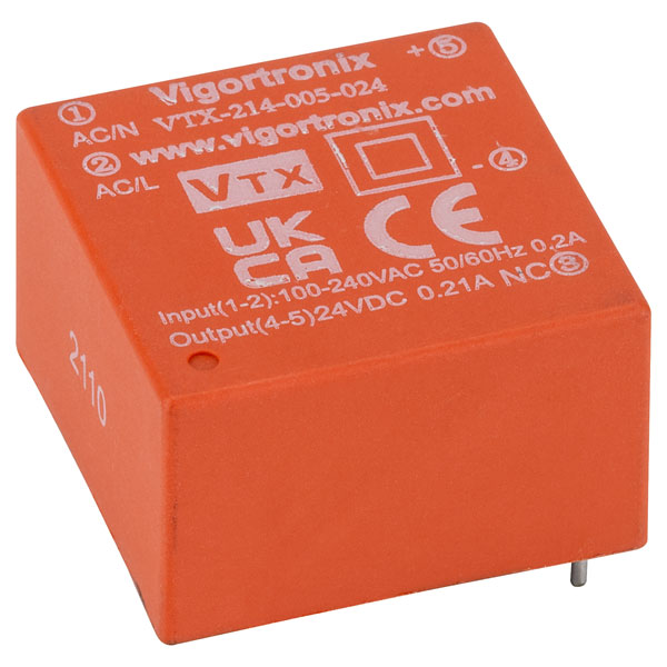 This Vigortronix AC-DC 5W single output miniature switched mode power supply (SMPS) is designed for applications where space is limited, thanks to the encapsulated design of the module which boasts over power, over current and short circuit protection.
