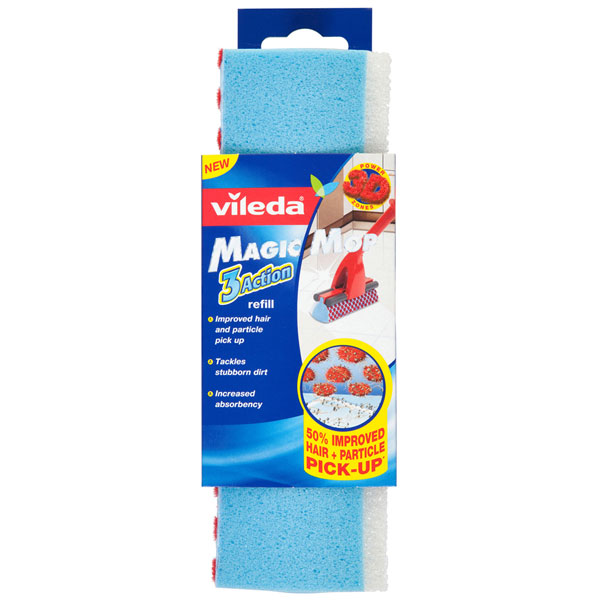 Mop refill for the Vileda Magic Mop. It has improved hair and particle pick up and quick direct release when rinsing the mop in water. It features an absorbent sponge and white non-scratch scourer zone for stubborn marks.