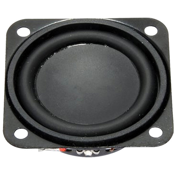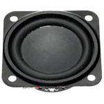 A 4cm (1.6in.) full-range speaker with coated paper membrane and black metal basket.