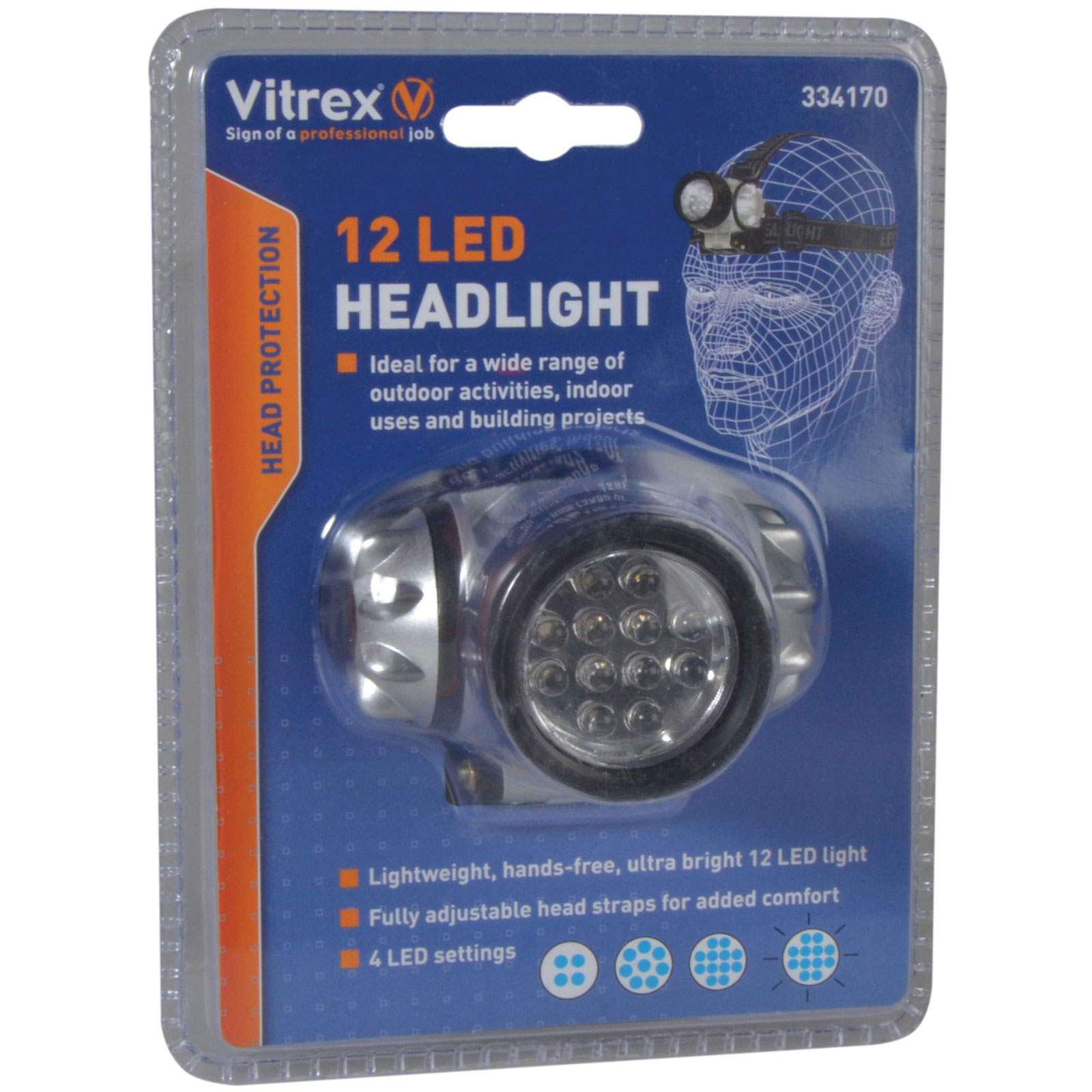 The Vitrex 334170 Headlamp is ideal for a wide range of outdoor activities, indoor uses and building projects. Made from lightweight, durable materials with fully adjustable head straps for added comfort. Offers 4 LED settings: 4 LED Beam (Square), 8 LED Beam (Circular,) 12 LED Beam(Square) and 12 LED Flashing.