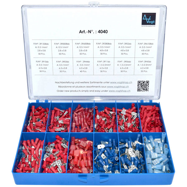 The Vogt Verbindungstechnik 4040 Crimp Connector Set includes 575 pieces, suitable for wire sizes from 0.50 mm² to 2.50 mm², in red and blue. This set contains crimp connectors, blade terminals, and ferrules for reliable electrical connections. Ideal for automotive, industrial, and electrical applications.
