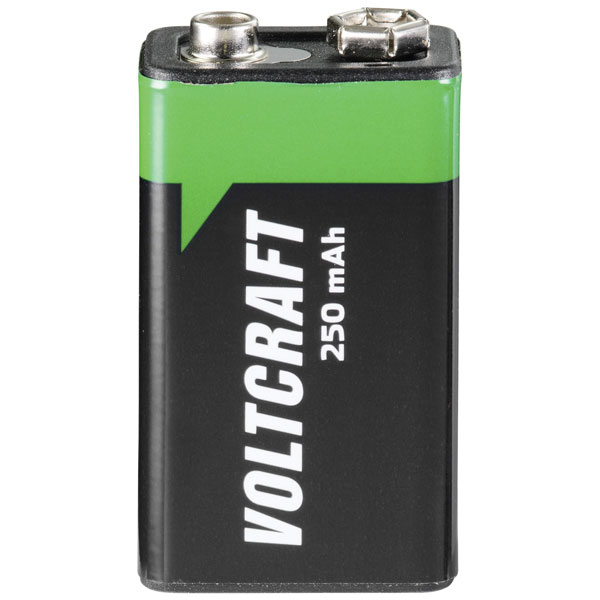 The VOLTCRAFT 9 V / PP3 battery is a rechargeable NiMH battery with a capacity of 250 mAh and a voltage of 8.4 V.