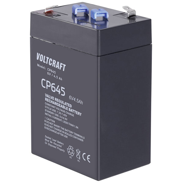 The VOLTCRAFT CE6V/4,5Ah VC-12713940 is a maintenance-free VRLA lead acid battery with dimensions of 70 x 107 x 47 mm, featuring 4.8 mm blade terminals.