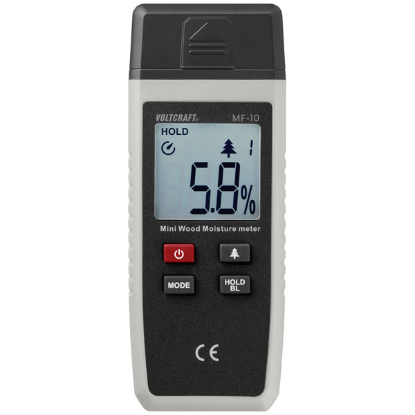 The VOLTCRAFT MF-10 moisture meter measures wood moisture with a range from 2 to 40%.
