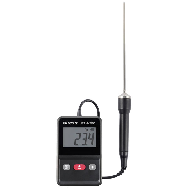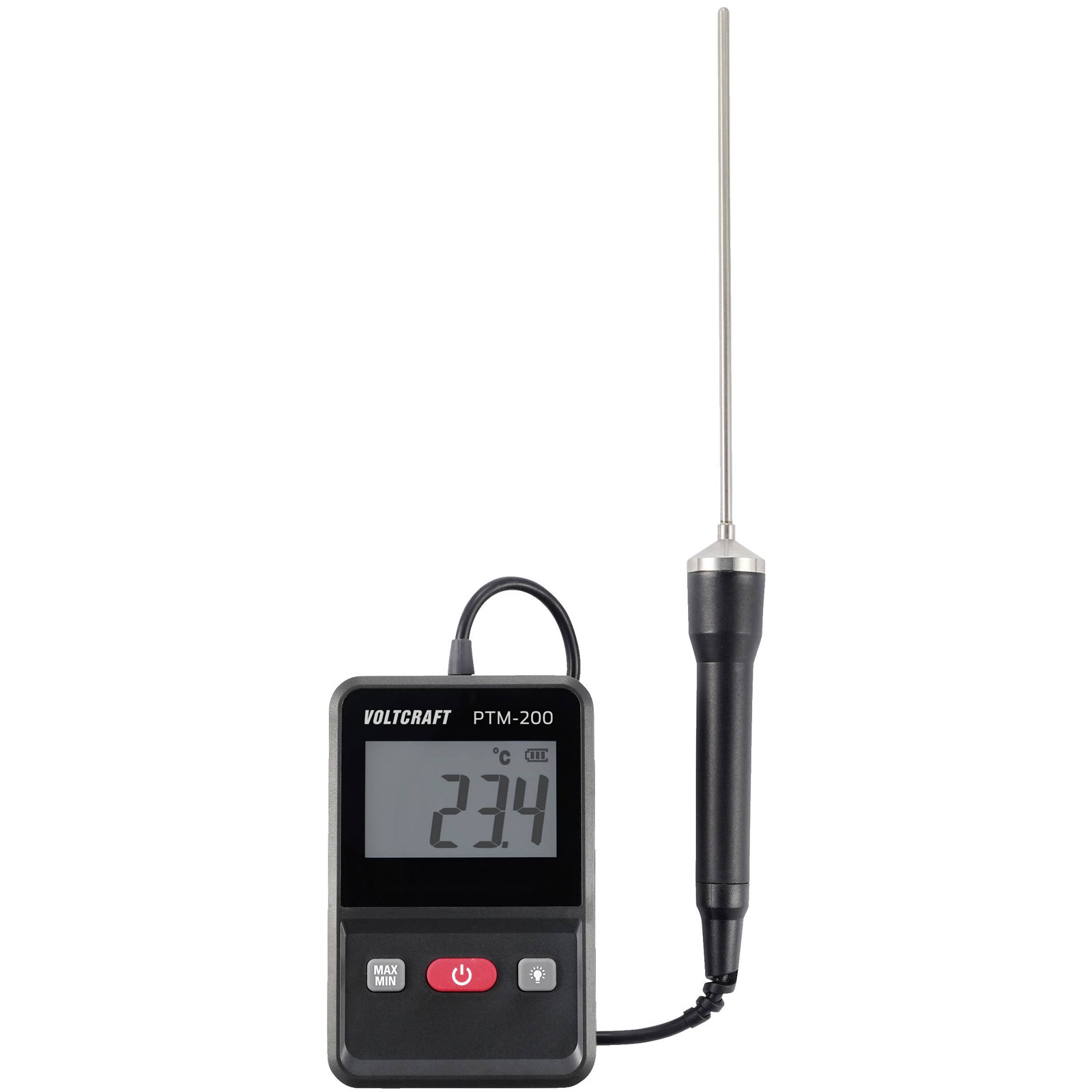 The VOLTCRAFT PTM-200 Probe Thermometer features a temperature reading range from -200 to 200 °C, with a Pt1000 sensor for precise contact measurement.