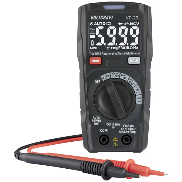 The VOLTCRAFT VC-23 is a handheld digital multimeter capable of voltage measurement up to CAT III 600 V with a display resolution of 6000 counts.