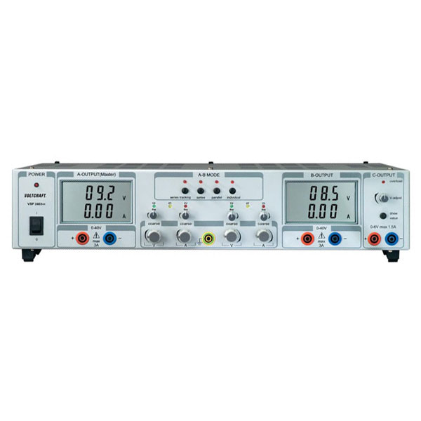 The Voltcraft VSP-2606 is from the successful VSP series of remotely controllable power supplies with sense function. It features 3 outputs with setting ranges 0.1 to 20V DC (0 to 6A), 0.1 to 20V DC (0 to 6A), 0 to 6V DC (1.5A) with course and fine adjustment on output 1 for V and I and adjustment for V on output 2.