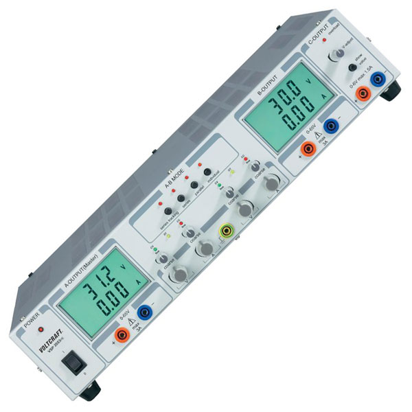 The Voltcraft VSP-2653 is from the successful VSP series of remotely controllable power supplies with sense function. It features 3 outputs with setting ranges 0.1 to 65V DC (0 to 3A), 0.1 to 65V DC (0 to 3A), 0 to 6V DC (1.5A) with course and fine adjustment on output 1 for V and I and adjustment for V on output 2.