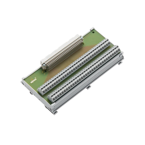 Interface modules from WAGO with male connectors suitable for horizontal DIN-35 rail mounting according to DIN 41612.