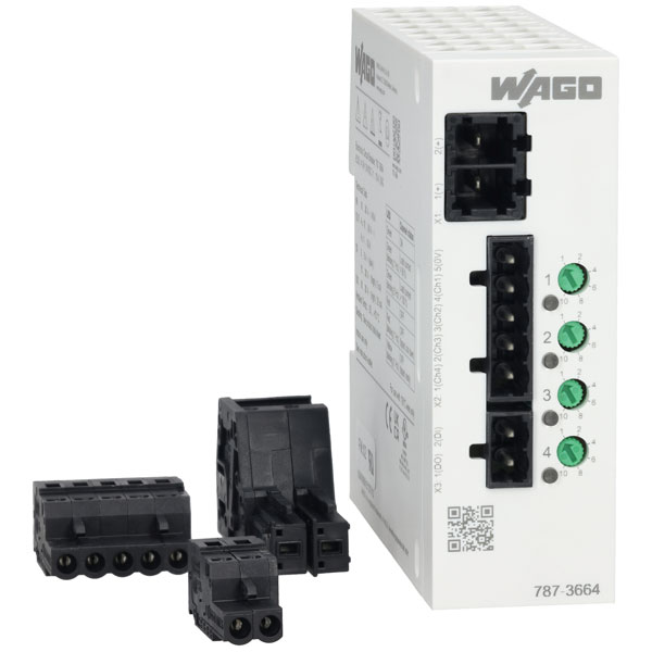 This WAGO 787-3664 Electronic Circuit Breaker (ECB); 4-Channel; 24V DC Input Voltage; Adjustable 1 … 10A; Signal Contact provides a space-saving solution for protection of 24V loads.
