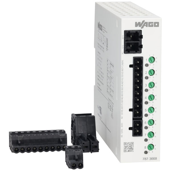 This WAGO 787-3668 Electronic Circuit Breaker (ECB); 8-Channel; 24V DC Input Voltage; Adjustable 1 … 10A; Signal Contact provides a space-saving solution for protection of 24V loads.
