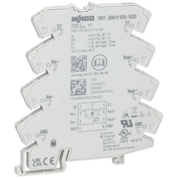This WAGO 787-3861/100-000 1-channel 24V DC, 1A Signal Contact Electronic Circuit Breaker (ECB) is a space-saving solution that provides safe and dependable tripping in the event of a short circuit or overload on its secondary side. Operation is easy and reliable, with LED status indication provided.