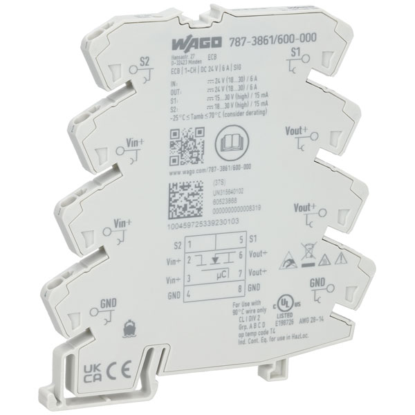 This WAGO 787-3861/600-000 1-channel 24V DC, 6A Signal Contact Electronic Circuit Breaker (ECB) is a space-saving solution that provides safe and dependable tripping in the event of a short circuit or overload on its secondary side. Operation is easy and reliable, with LED status indication provided.