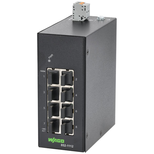 The WAGO 852-1112 8 Port Industrial ECO Switch has 8 Gigabit RJ45 Ethernet ports, and is suitable for medium sized networks.