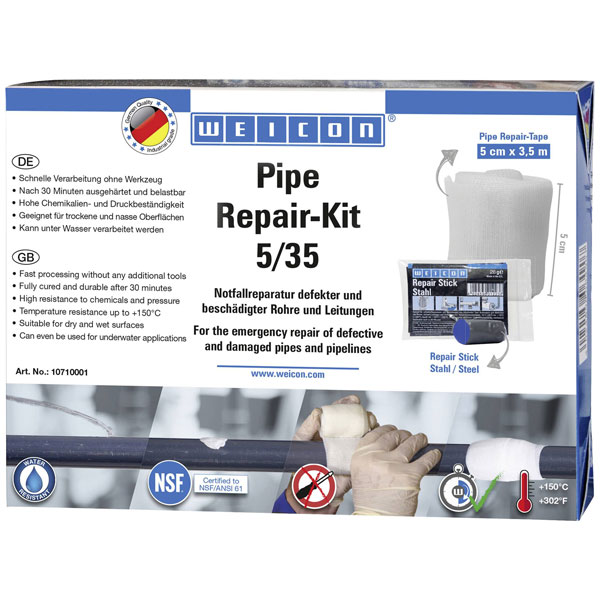 The Pipe Repair Kit can be processed without any additional tools and is used for the reliable and permanent sealing of cracks and leaks. It is very easy and quick to use and shows excellent adhesive properties, high pressure and chemical resistance as well as temperature resistance up to 150°C. Within 30 minutes, the tape is fully cured and hard-wearing.