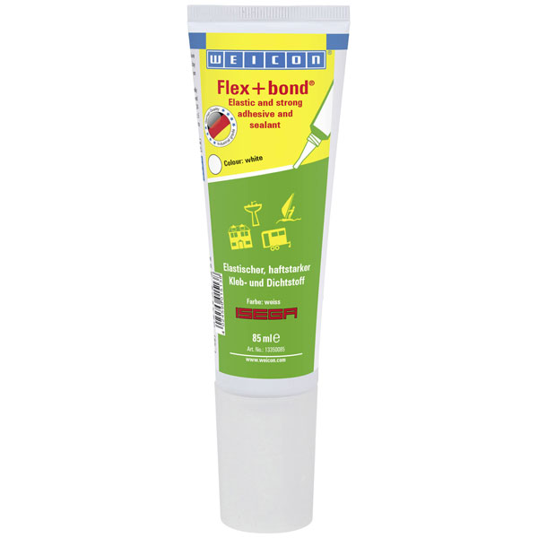 WEICON Flex+bond is strong, permanently elastic, temperature-resistant from -40°C to +90°C (-40°F to +194°F), weather-resistant, resistant to UV rays, paintable (wet-on-wet), sandable and resistant to ageing and salt water. It is free of silicone, isocyanate, halogens and solvents.