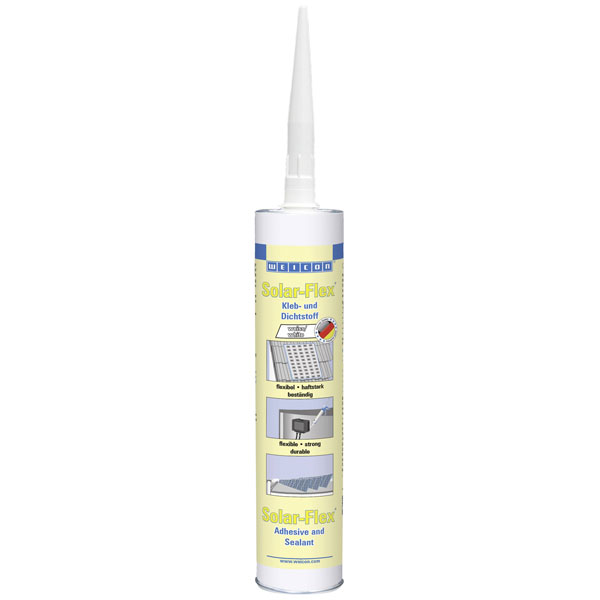WEICON Solar-Flex is strong, non-corrosive, paintable (wet-on-wet), weather-resistant and resistant to UV rays. It is free of silicone, isocyanate, halogens and solvents. Solar-Flex is an elastic adhesive based on MS polymer specially developed for the solar industry.