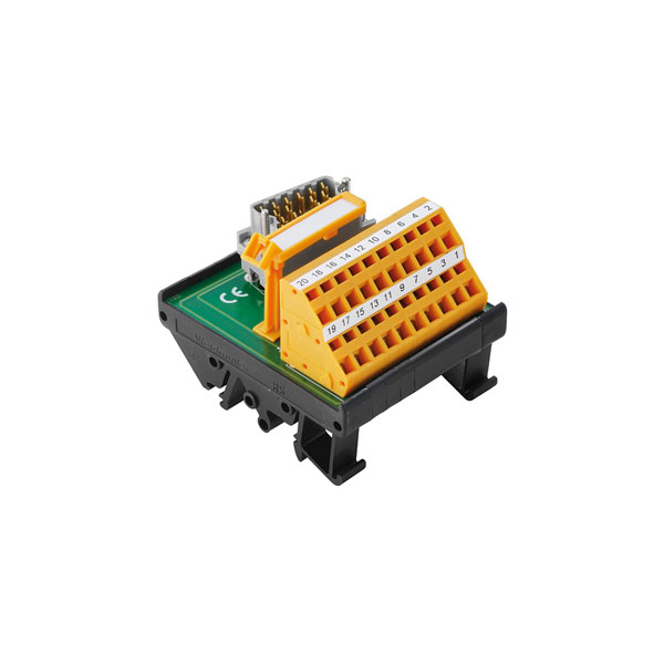 Weidmüllers interface module with ELCO plug-in connector is a 20-pole solution designed for reliable signal transmission. This module features robust construction for industrial environments and ensures secure connections in complex systems. It is typically used in automation and control applications, providing efficient interfacing for various electronic components.