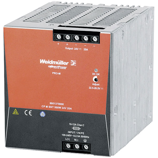The Weidmüller 8951370000 is a PRO-M CP T SNT 500W 24V 20A DIN Rail Power Supply and a perfectly reliable PSU for automation technology.