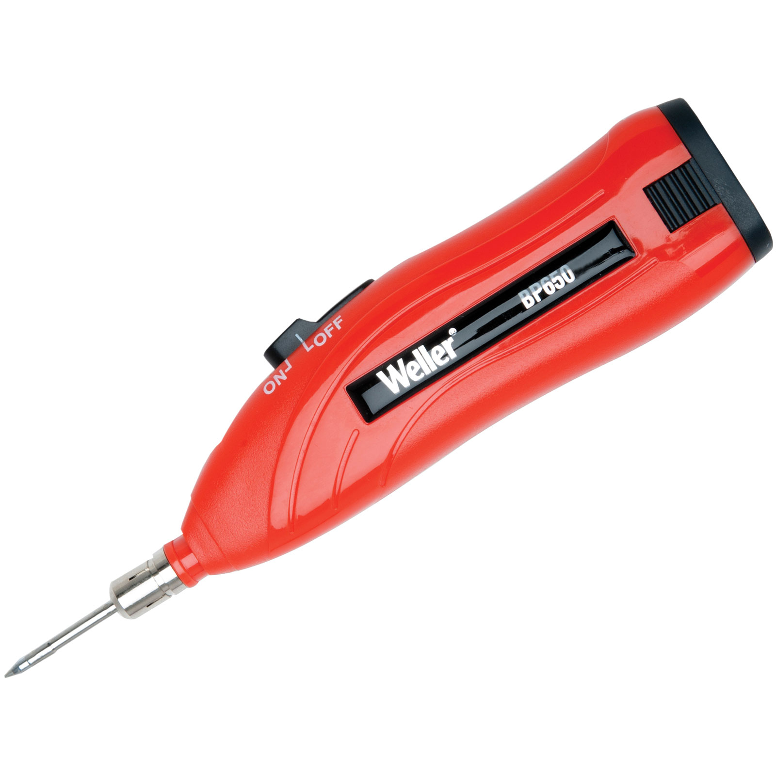 The Weller Battery Powered Cordless Soldering Iron heats up to working temperature in under 30 seconds. It does up to 120 solder joints per set of (3) alkaline batteries. A red indicator light shows that the power is on.
