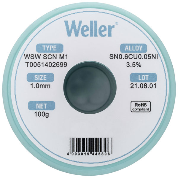 Weller T0051402699 Solder Lead-Free 100g 1mm Reel Sn0.6Cu0.05Ni