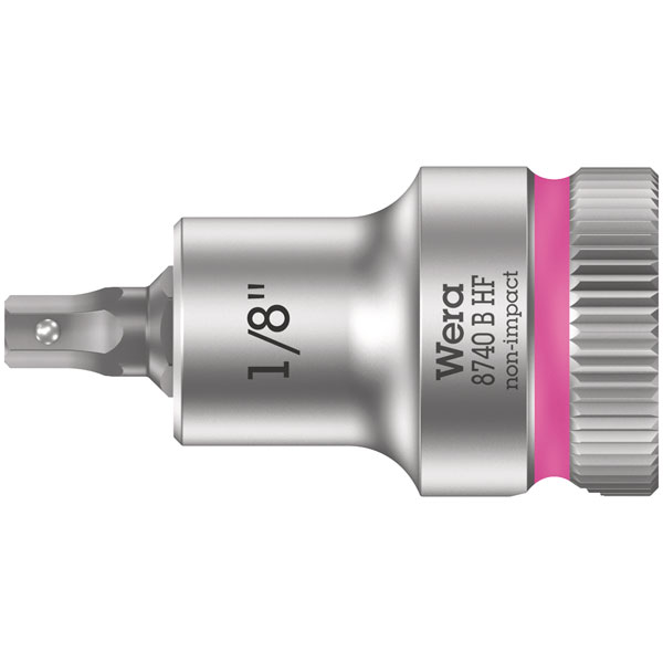 This Wera 8740 B HF Zyklop bit-socket has a 3/8in. square drive and contains a 1/8in. hex-plus driver bit with holding function. The holding function is extremely convenient for screwdriving, with reduced risk of dropping the screw when addressing the workpiece.