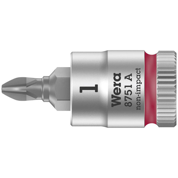 Design:Manual and (non-impact) machine applications, ball intercept ring, knurls at base for precision handling in manual operations, bit sockets with all the advantages of the Wera bit technology, brushed chrome-plated finish. Output colour coding (red = Phillips) and large stamp to enable the desired bit socket to be easily located.