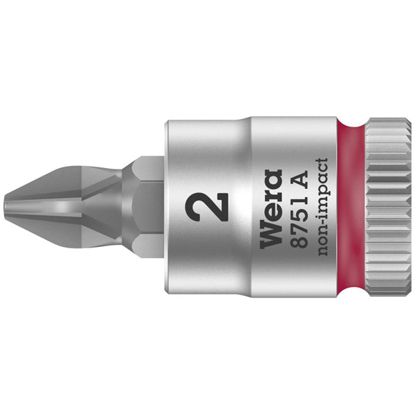 Design:Manual and (non-impact) machine applications, ball intercept ring, knurls at base for precision handling in manual operations, bit sockets with all the advantages of the Wera bit technology, brushed chrome-plated finish. Output colour coding (red = Phillips) and large stamp to enable the desired bit socket to be easily located.