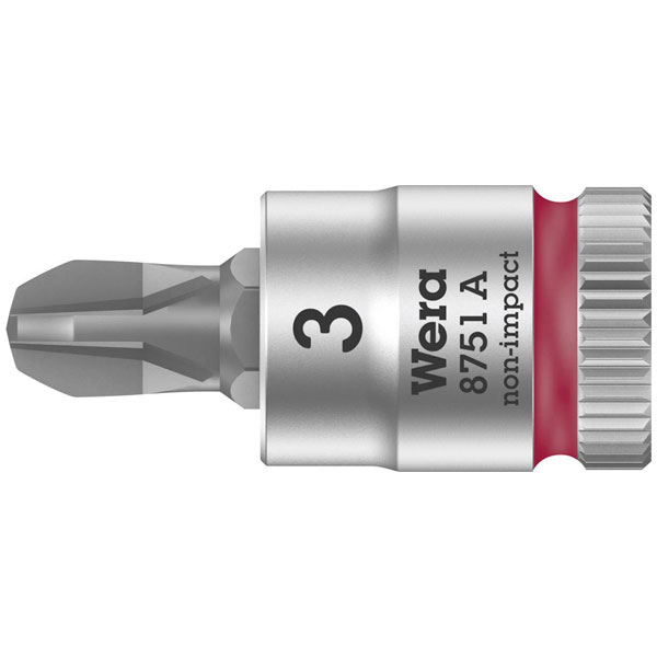 Design:Manual and (non-impact) machine applications, ball intercept ring, knurls at base for precision handling in manual operations, bit sockets with all the advantages of the Wera bit technology, brushed chrome-plated finish. Output colour coding (red = Phillips) and large stamp to enable the desired bit socket to be easily located.