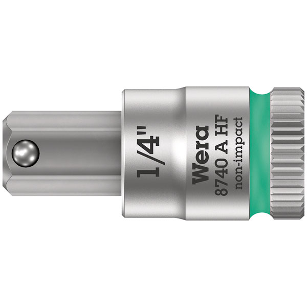 This Wera 8740 A HF Zyklop bit-socket has a 1/4in. square drive and contains a 1/4in. hex-plus driver bit with holding function. The holding function is extremely convenient for screwdriving, with reduced risk of dropping the screw when addressing the workpiece.