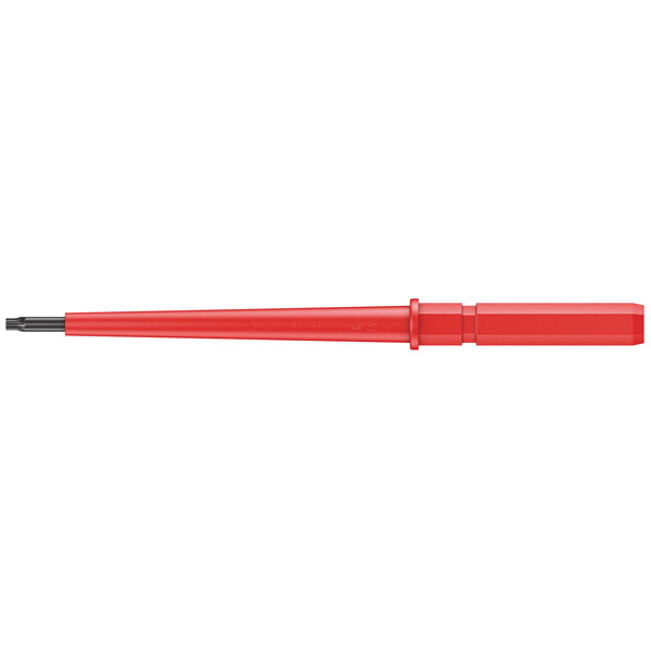 The Wera Kraftform Kompakt VDE 67i is an interchangeable screwdriver bit designed for precision and efficiency. This VDE TORX bit guarantees safety when working with electrical installations. It is typically used for professional applications involving electrical and mechanical tasks.