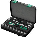 This set from Wera includes 1 Zyklop ratchet with 1/4in drive, long and short extensions with free-turning sleeve, 1 sliding T-handle and 1 universal joint, plus a selection of 13 metric Zyklop sockets, supplied in a strong metal case.