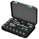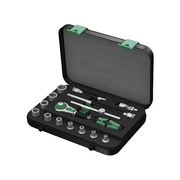 This 15-piece set from Wera includes 1 Zyklop ratchet with 1/4in drive, 10 imperial sockets plus long and short extensions (with free-turning sleeve), a sliding T-handle and a universal joint, supplied in a strong metal case.