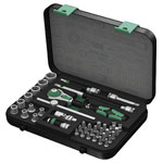 This 41-piece set from Wera includes 1 Zyklop ratchet with 1/4in drive, 10 imperial sockets plus long and short extensions (with free-turning sleeve), a wobble extension, a sliding T-handle, a universal joint, 1 adaptor with quick-release chuck and 24 assorted bits, supplied in a strong metal case.