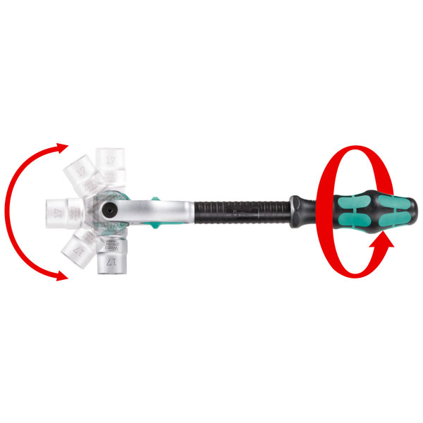 Incorporating a flywheel design and easy-to-grip free-turning sleeve for faster work, along with a swivel ratchet head, defined lock positions at 0° and 90° to the left and right, as well as at 15° before 90° inwards - at 0° it can be used like a conventional screwdriver.