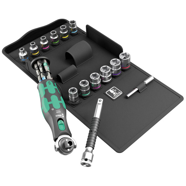 Comprehensive and space-saving ratchet/screwdriver combination. Compact Zyklop ratchet with bit magazine for the pocket. Magnetic direct mounting for ¼" bits and 3/8" sockets. Rapid tool change thanks to the non-locking mounting. As the head is lockable at 0°, 15° and 90°, the tool can be used as a ratchet and as a ratchet screwdriver. The fine toothing with 72 teeth allows for a low return angle of 5°. Wide range of applications thanks to 12 bits integrated in the handle. The robust ratchet mechanism allows for ample torque. Perfect combination of a Zyklop ratchet with a 12-piece screwdriver set. The 75 mm long universal holder for 1/4" bits can be used as an extension. Including sockets in the commonest dimensions. In a textile box, which can be docked onto the Wera 2go system.
