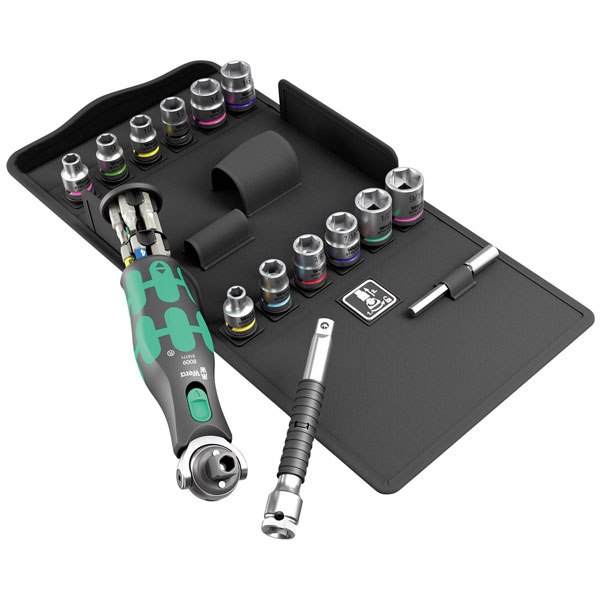 27-piece set; one Zyklop Pocket 8009 for 3/8" square head sockets as well as 3/8" connectors with square head drive; also suitable for bits with 1/4" external hexagon drive as per DIN ISO 1173-C 6.3 and E 6.3 and Wera connection series 1 and 4. 3/8" ratchet and 1/4" bit ratchet screwdriver; freely swivelling ratchet head; pre-defined positions at 0°, 15° and 90° to the left and right; can be used as a conventional screwdriver in the 0° position; clockwise/anti-clockwise switching, fine-toothed, small return angle of 5°; magnetic direct mounting. Multi-component Kraftform handle for fatigue-free working; captive, freely swivelling magazine with 12 bits integrated in the handle, 1/4", 25 mm length. One Zyklop extension 8794 SB with fast-rotating sleeve, short; one universal holder (75 mm length) with stainless steel sleeve and strong permanent magnet, suitable for mounting bits with 1/4" external hexagon drive as per DIN ISO 1173-C 6.3 and Wera connection series 1; 12 Zyklop sockets, 3/8"; one robust textile box, can be docked onto the Wera 2go system.