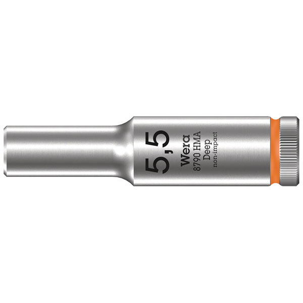 Wera 8790 HMA Deep 1/4" socket 5.5 x 50mm is a long 1/4" hand and machine socket (ISO 2725 part 3) with ball intercept ring; for external hexagonal bolts and sockets.